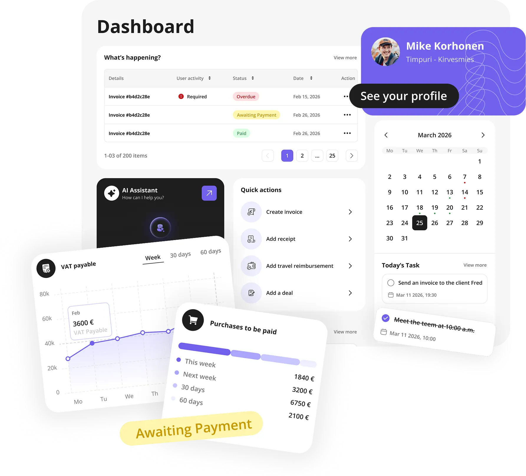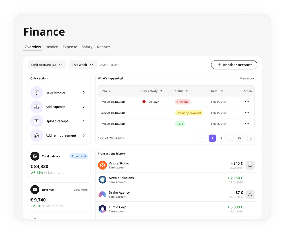 With Quulio, you can manage key parts of running your business in one place — including invoices, expenses, contracts, files, projects, and other important admin tasks. We promise you will only need a bank account and Quulio to run successful business. The goal is to give you one clear system instead of a scattered setup.